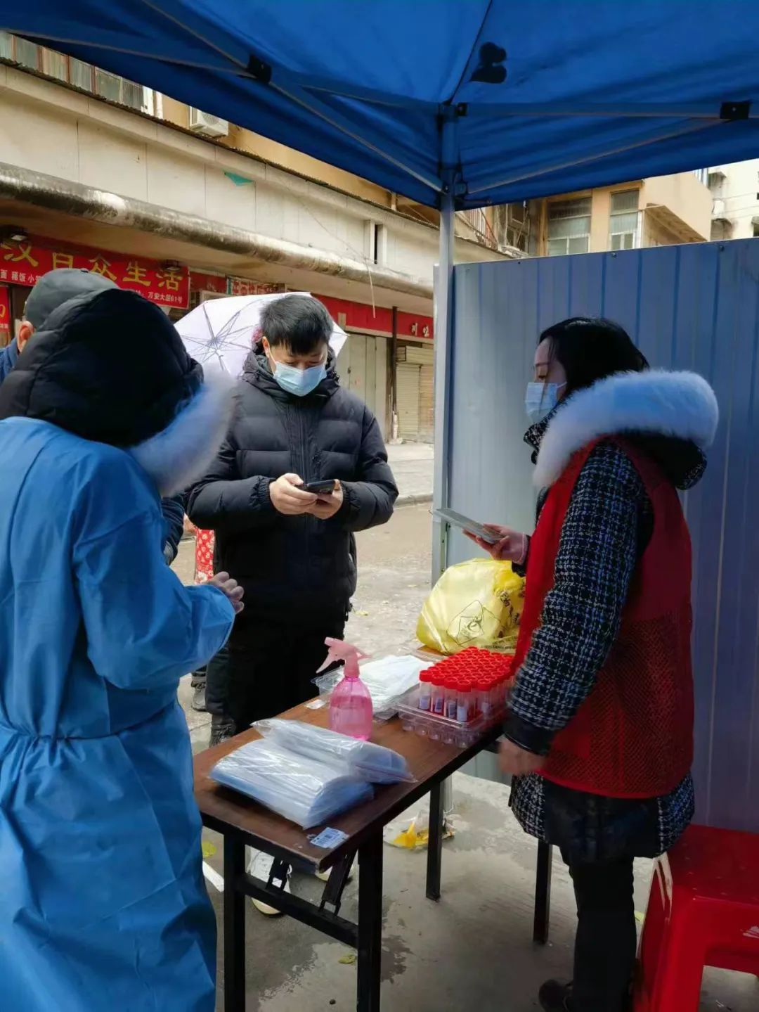 ? ? ? ?“請在這里掃碼,注意排隊保持安全距離。”11月30日,在漢正街道萬安社區核酸采樣點,碧投公司志愿者不斷向前來咨詢的居民介紹注意事項、引導排隊秩序、進行掃碼登記。? ? ?