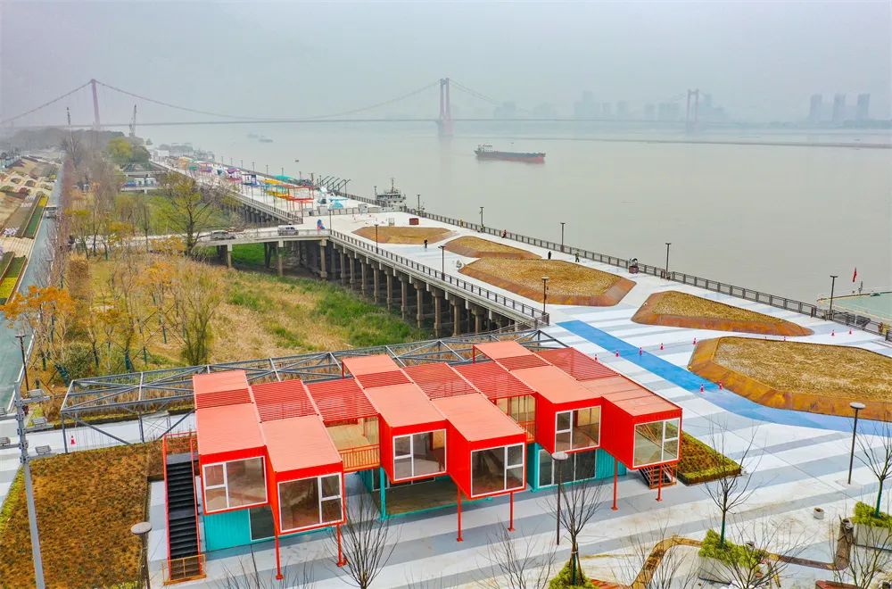 ? ? ? ?原碼頭伸向江心的高樁平臺被保留下來,以“浮江展廳”為設計理念,進行整體規劃。龍門吊和集裝箱是碼頭最具代表的工業元素,慶典廣場,一座巨型龍門吊被保留在了廣場中央,改造成了長江江面上的第一處水幕電影的“放映機”,可以作為大型活動、表演場地。一旁的集裝箱工坊則可用于驛站或服務中心,更重要的是,集裝箱和拼裝式防洪墻可根據防汛需要即時拆建。